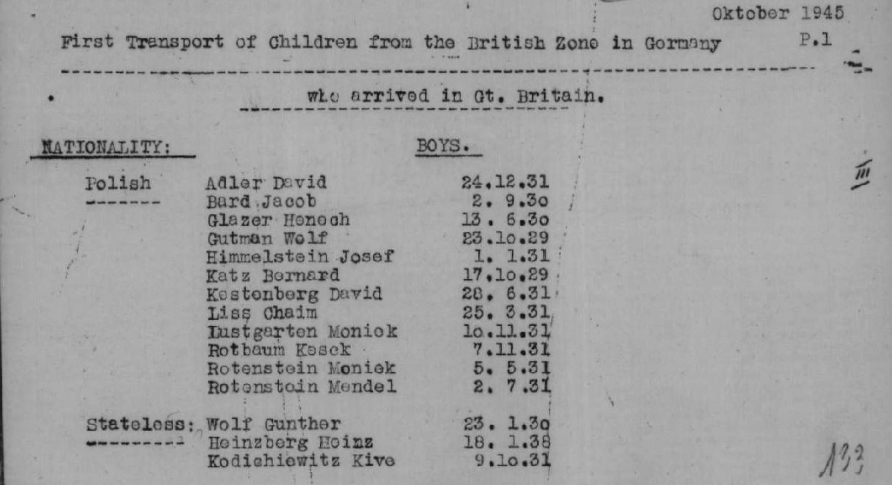 For each of the Boys, these lists provided Whitehouse with names, birthplace, age, Displaced Person (DP) number, point of departure for Britain and the date of arrival in the UK. In some cases, this is all the information that is available so far.