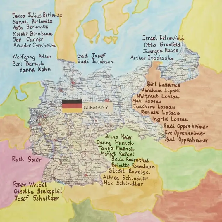 When I decided to create the shape of the country with the names, I had to plan it all meticulously to ensure every name was included. No easy task. Then came the actual writing using a broad-edged pen and five different paints in “earth” colours. I wanted to give each individual their due respect so changed the colour for each person as I wrote along the line. In consequence my progress was slow and on average only managed 15 names an hour! However it was well worth it to once again be able to play a small part in both commemorating and celebrating the lives of this group of Holocaust survivors.”